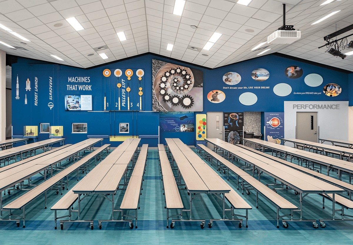 The Cafeteria, also known as Learning Piazza, serves as both a cafeteria and an auditorium. The space was furnished with Mobile Convertible Bench Tables that can be converted from a dining table to bench configuration with a full backrest.