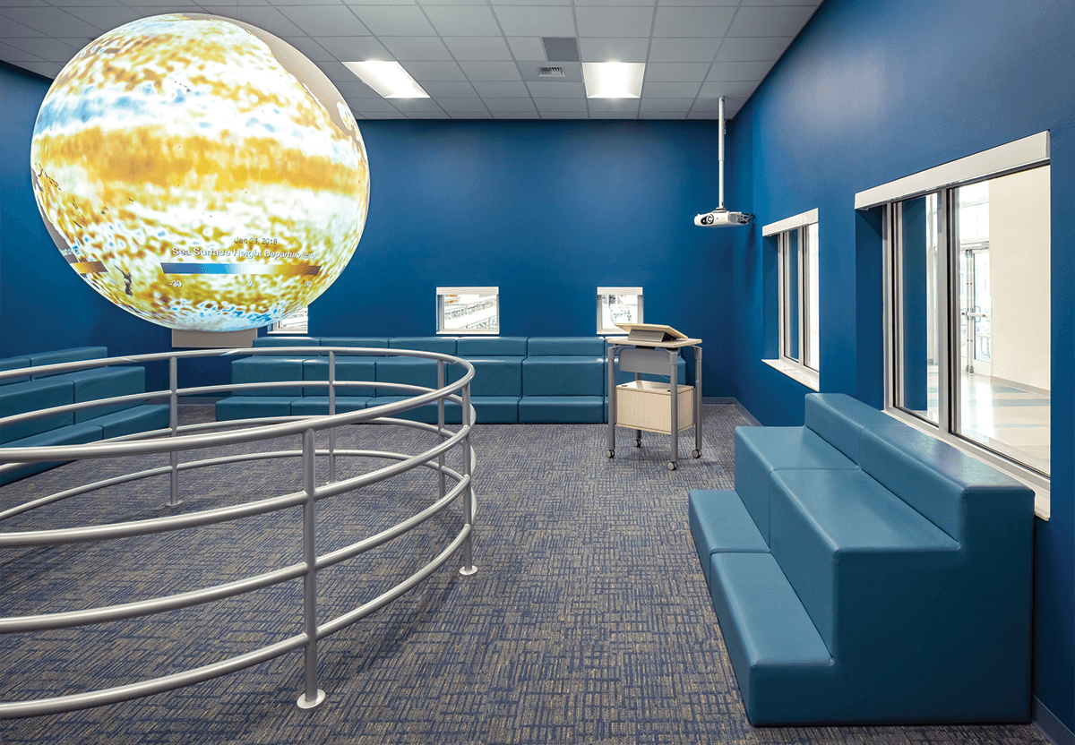With new technology for its students, the school developed STEM spaces, including a marine-science-lab, outdoor lakeside amphitheater and dock and a “Science-On-a-Sphere” lab that uses projectors to display aspects of the earth on a large globe. The lab was furnished with stadium-style soft seating and a mobile lectern so students and the instructor could work anywhere in the lab.