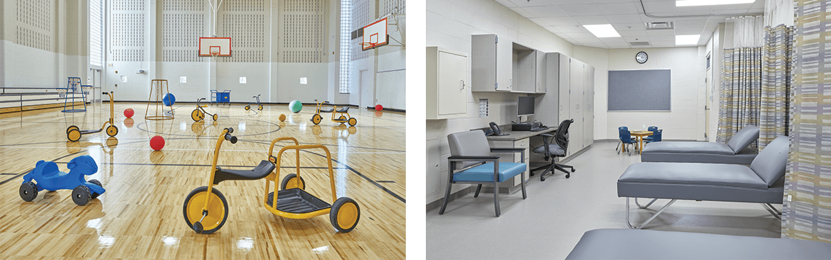 The gymnasium was filled with tricycles and other active play items. The clinic was furnished with first-aid beds and Analogy Series Chairs.