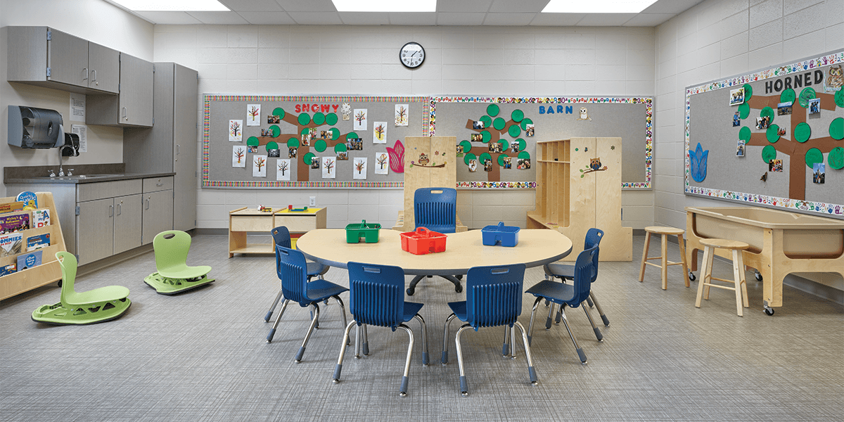 Classrooms were designed with structured spaces for students to learn and develop skills to prepare for elementary school. 4000 Series Activity Tables with Analogy® Series Chairs allow for group learning at tables; ZUMA® Series Floor Rockers are ideal for circle time and Play Centers inspire creative play.