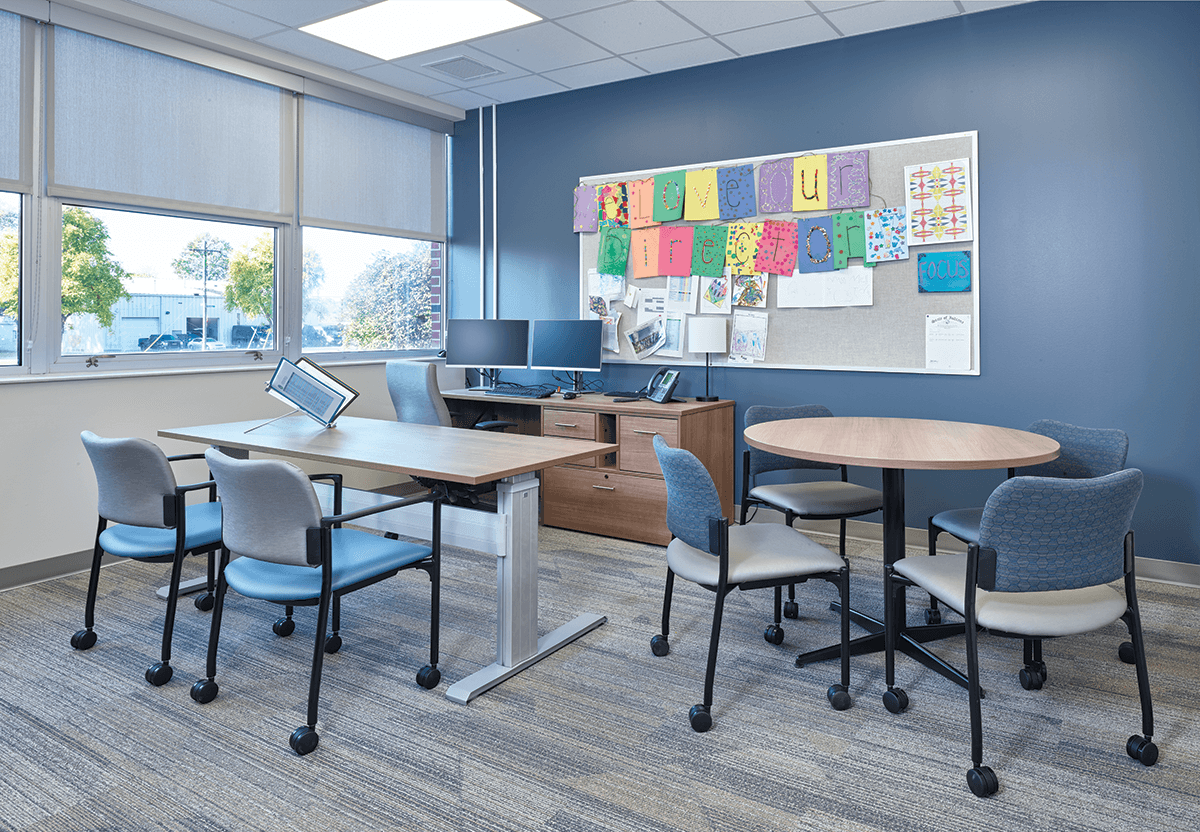 Administrative Offices include sit-to-stand desks, as well as inviting spaces for staff to meet with parents.