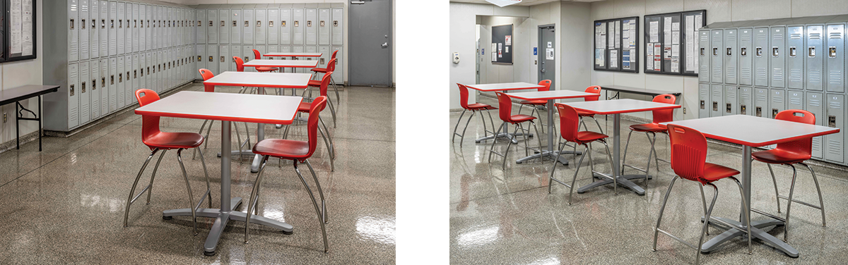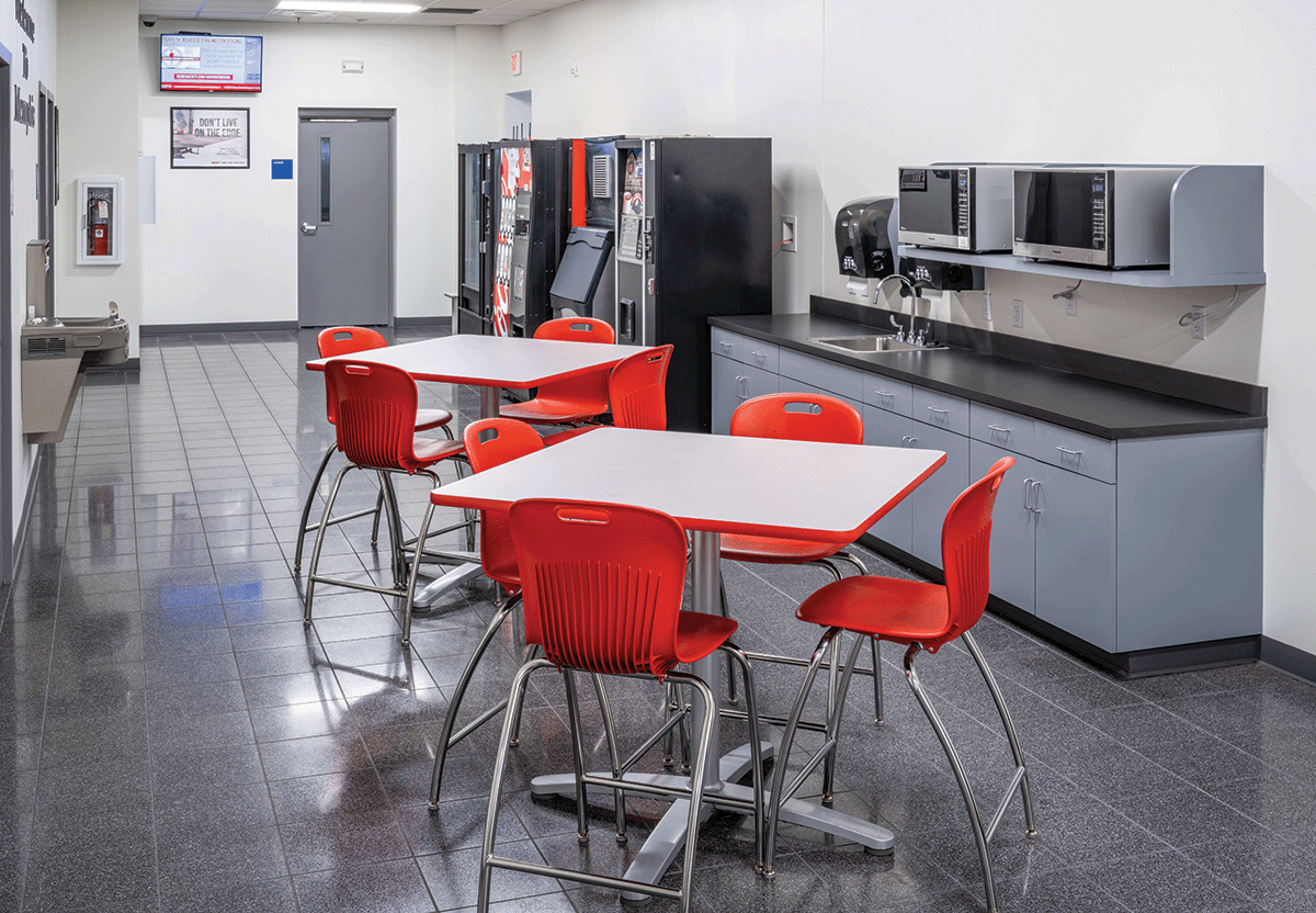 Break rooms in the driver support center were designed to include various seating arrangements making the space comfortable and inviting. Lunada Series cafe-style tables with Sure Edge banding were paired with Sage Series Chairs and Stools for employees to meet, get some work done or enjoy a meal. Colors were selected to match Averitt Express’ signature brand color creating a familiar and coordinated place to rest and recharge.